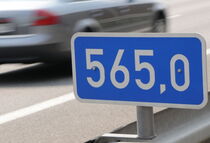Auf Autobahnen, z. B. eine Brücke, ein Rasthof, ein kleines blaues Schild an der Leitplanke (Kilometierung).
