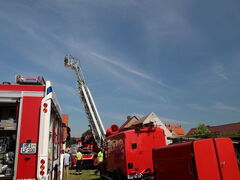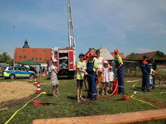 Da sich das Fest natürlich auf dem Gelände des Gerätehauses der Ortsfeuerwehr abspielte, durften auch feuerwehrtechnische Attraktionen nicht fehlen. So rückten die Kameraden der Großenhainer Wehr mit der Drehleiter an. Ebenfalls vertreten waren natürlich die Jugendfeuerwehren der Umgebung, so bot sich auch die Gelegenheit sämtliche Spielutensilien der Atze-Feuerwehr der Jugendfeuerwehr Großenhain auszuprobieren und sich, betreut und beraten durch die Kinder und Jugendlichen der Jugendfeuerwehren Bauda und Großenhain, selbst einmal an Kübelspritze und Strahlrohr zu versuchen.