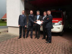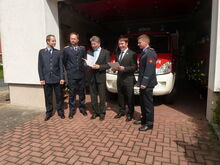Sichtlich begeistert nahmen unser Oberbürgermeister Herr Dr. Mißbach, die Skauper Ortswehrleitung Herren Renè und Maik Schumann und Stadtwehrleiter Herr Maik Häßlich den Fördermittelbescheid entgegen.